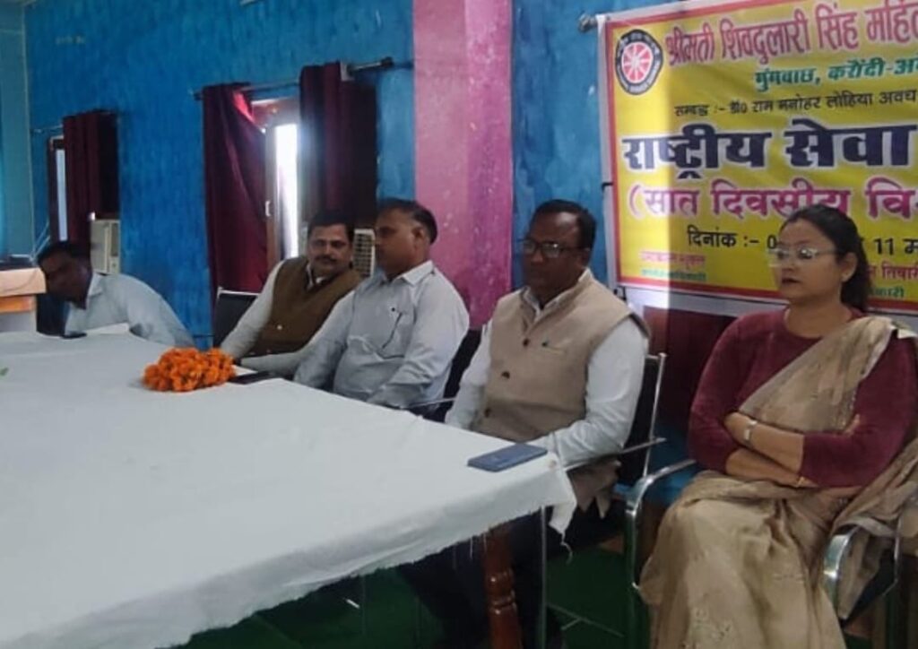 जनपद अमेठी । आज विशेष राष्ट्रीय सेवा योजना के सात दिवसीय विशेष शिविर के आयोजन के तीसरे दिन की शुरुआत माँ सरस्वती की प्रतिमा पर पुष्प अर्पित कर प्रार्थना और लक्ष्य गीत के साथ किया गयाl तत्पश्चात स्वयंसेविकों द्वारा स्वच्छता एवं पौधारोपण कराया गयाl इसके उपरांत भोजन एवं विश्राम के पश्चात दूसरी पाली में बौद्धिक कार्यक्रम का आयोजन किया गया, जिसमें महाविद्यालय प्रबंधक श्री अशोक सिंह जी नें “पढ़े बेटियां बढ़े बेटियां “पर विशेष व्याख्यान प्रेषित किये। आगे सभी अपने – अपने विचार रखें और व्यक्त किये ,अरविन्द कुमार कल्लू सिंह संरक्षक एवं उद्योगपती अमेठी नें राष्ट्रीय महिला दिवस को लेकर आज के दौर में महिला किसी से कमजोर एवं पीछे नहीं होने का दावा किया हैं आज महिलाए प्रत्येक क्षेत्र में सबसे आगे चल रहीं हैं ।महाविद्यालय निदेशिका डॉ पूनम सिंह जी ने दहेज प्रथा,भ्रूण हत्या जैसी कुरीतियों पर अपने मार्मिक विचार रखें, महाविद्यालय प्राचार्य डॉ दिनेश कुमार श्रीवास्तव एवं डॉ रमेश चंद्र शुक्ल ने अपने-अपने विचार प्रस्तुत किये,कार्यक्रम अधिकारी डॉ राम लखन तिवारी जी ने “शिक्षा ही जीवन पथ का दीपक है ” इसलिए सब पढ़े सब बढ़े जैसे समसामयिक विषय पर अपने विचारों को रखा, इस अवसर पर श्रीमती सीमा सिंह श्रीमती पूजा सिंह, श्रीमती आयुषी पांडेय,श्रीमती प्रीति यादव, श्रीमती अभिषेक किरण सिंह, डॉ अनामिका सिंह श्री जितेंद्र पटेल श्री लाल जी यादव श्री अरुण कुमार यादव जी ने अपने-अपने विचार रखें, | कार्यक्रम अधिकारी श्री उमाकांत शुक्ल एवं राम लखन तिवारी जी ने आप सभी का आभार व्यक्त किय।
